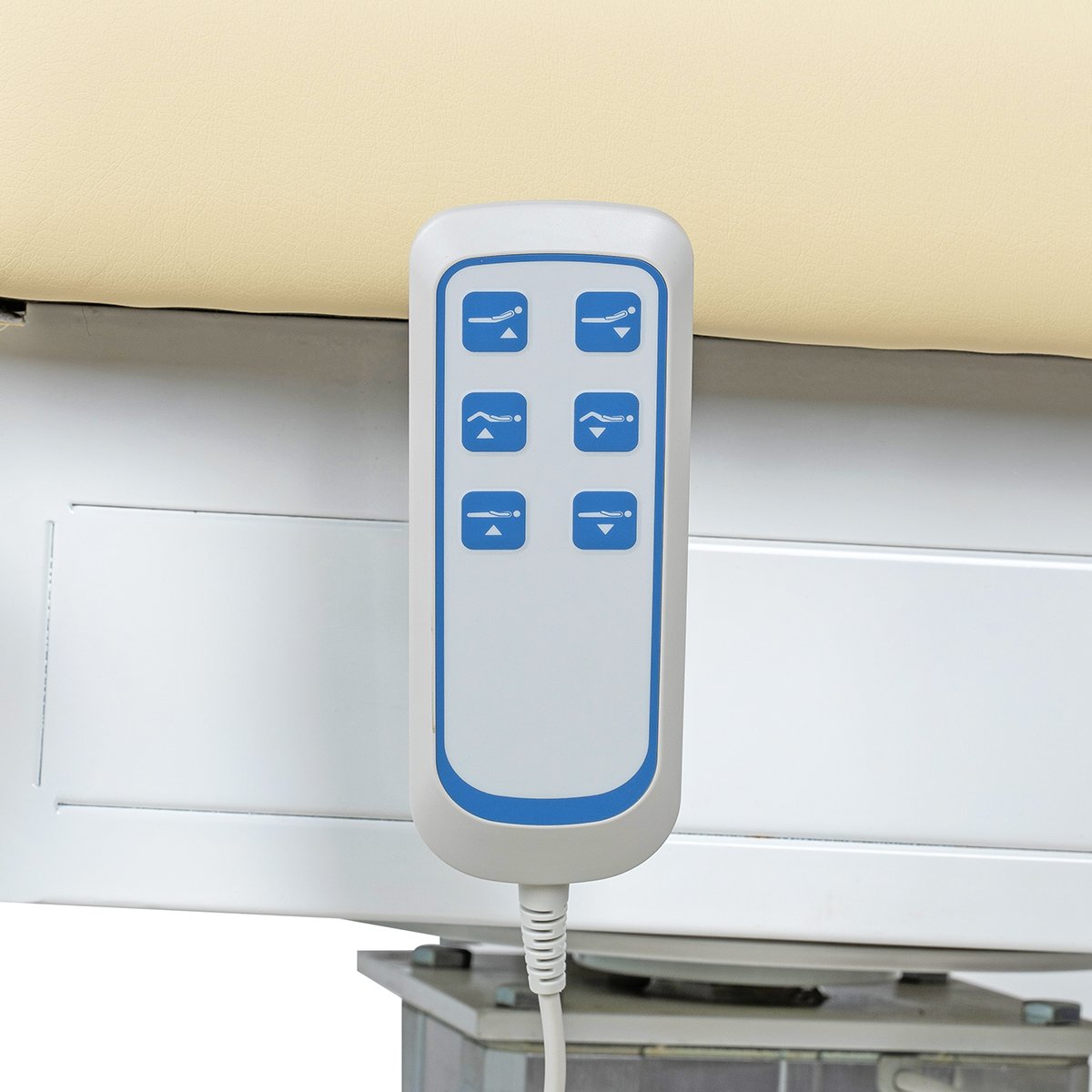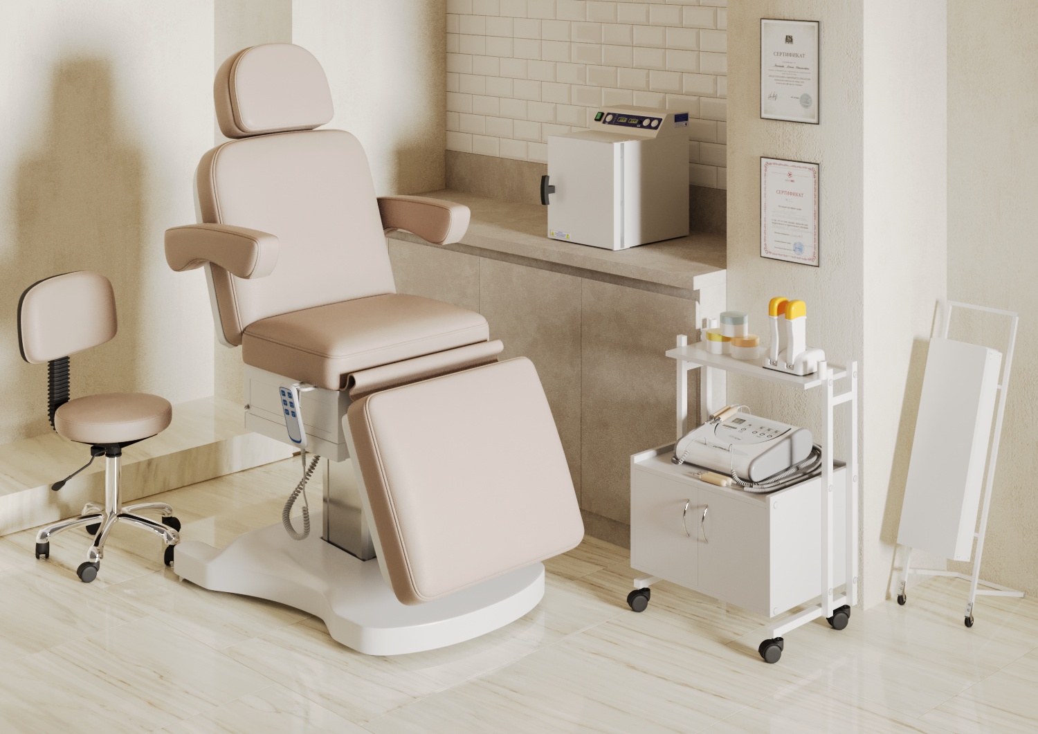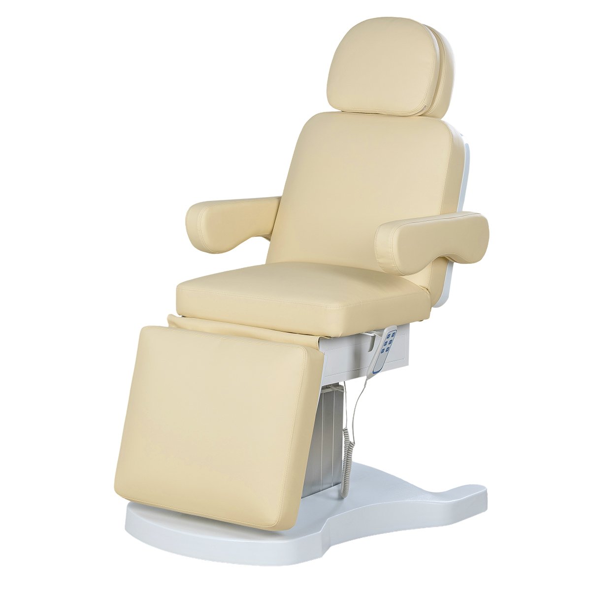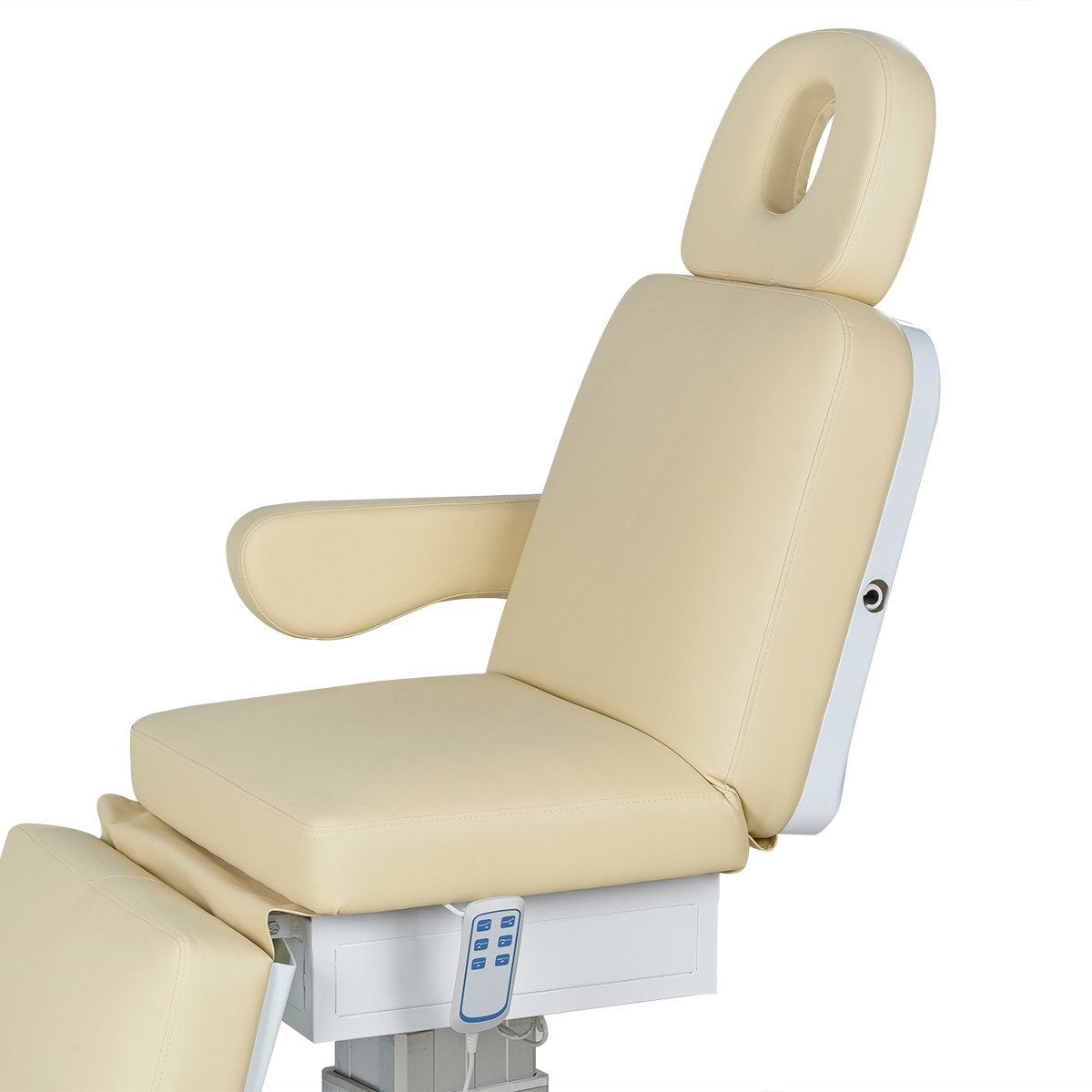 Стильная колонна скрывает все механизмы, а основание с углублением обеспечивает удобный подъезд мастера. Отлично подойдёт для массажей, инъекций и эстетических процедур.