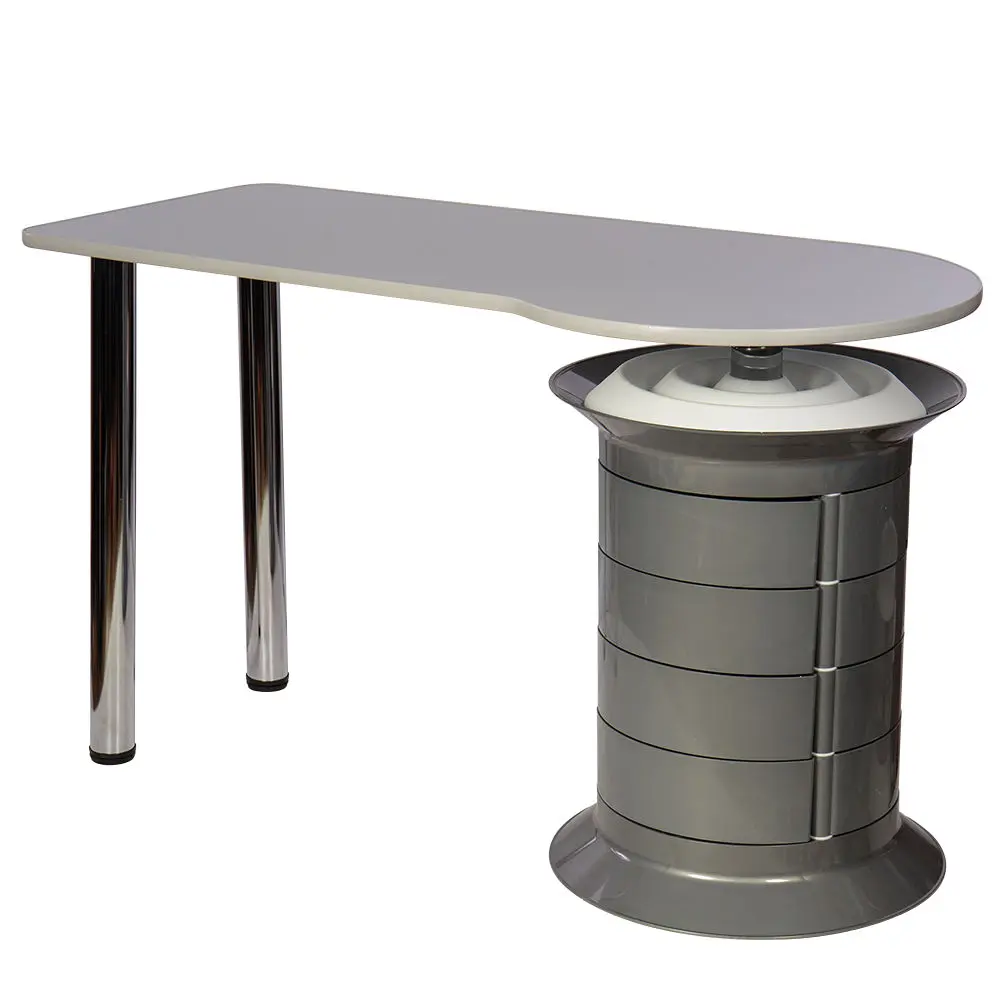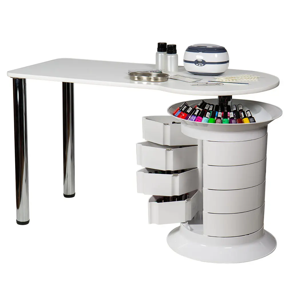 Инструменты, расходные материалы и аксессуары можно хранить в удобных выдвижных ящичках. Мастер сможет с легкостью находить необходимые приспособления, ведь тумбу можно вращать вокруг своей оси. Для лаков над тумбой предусмотрена удобная полочка. С широкой столешницей есть возможность поставить необходимое сопутствующее оборудование, не загромождая рабочую поверхность.