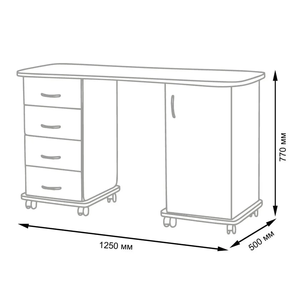 Комплектация: стол, две тумбы (с полками и дверкой, с выдвигающимися ящиками), колеса.