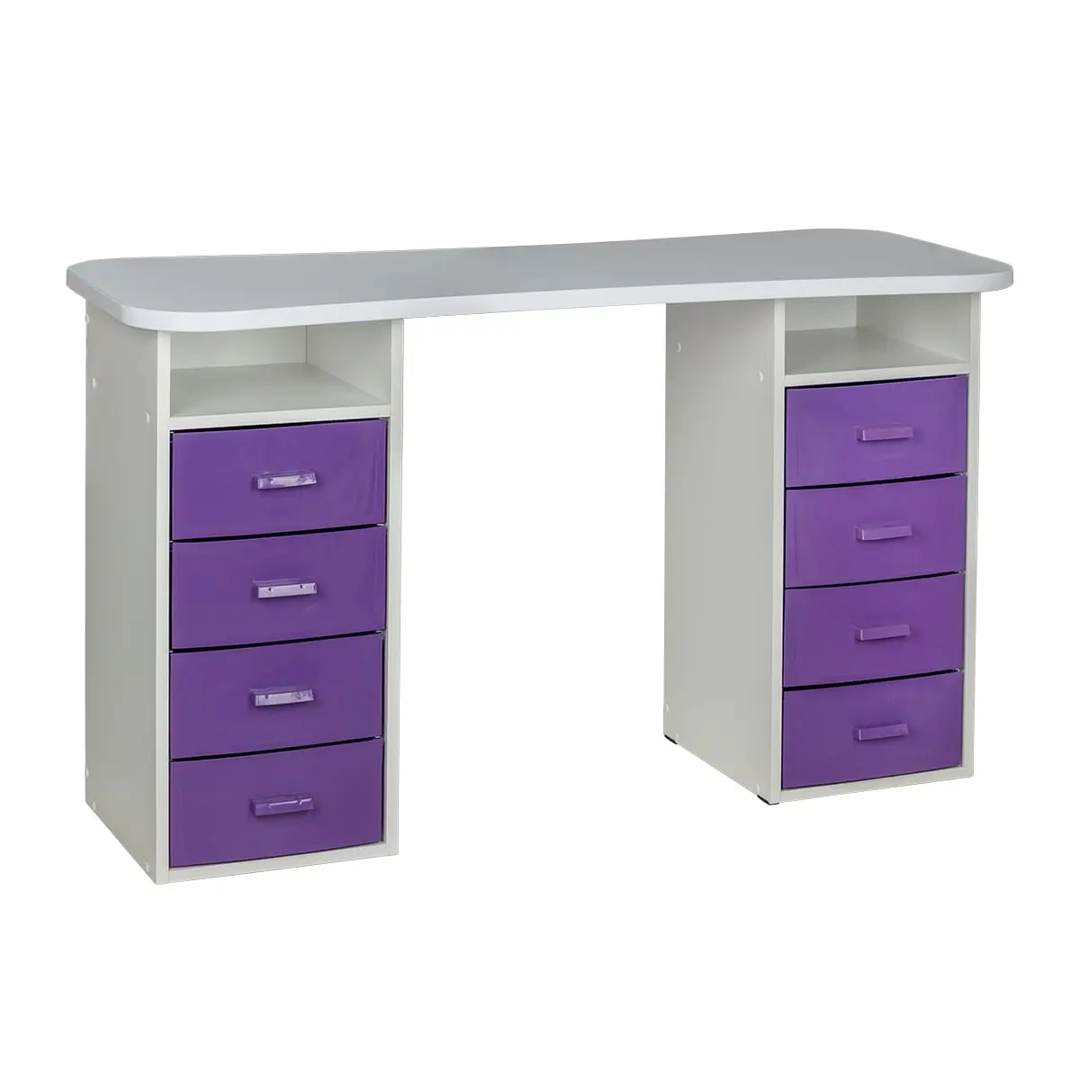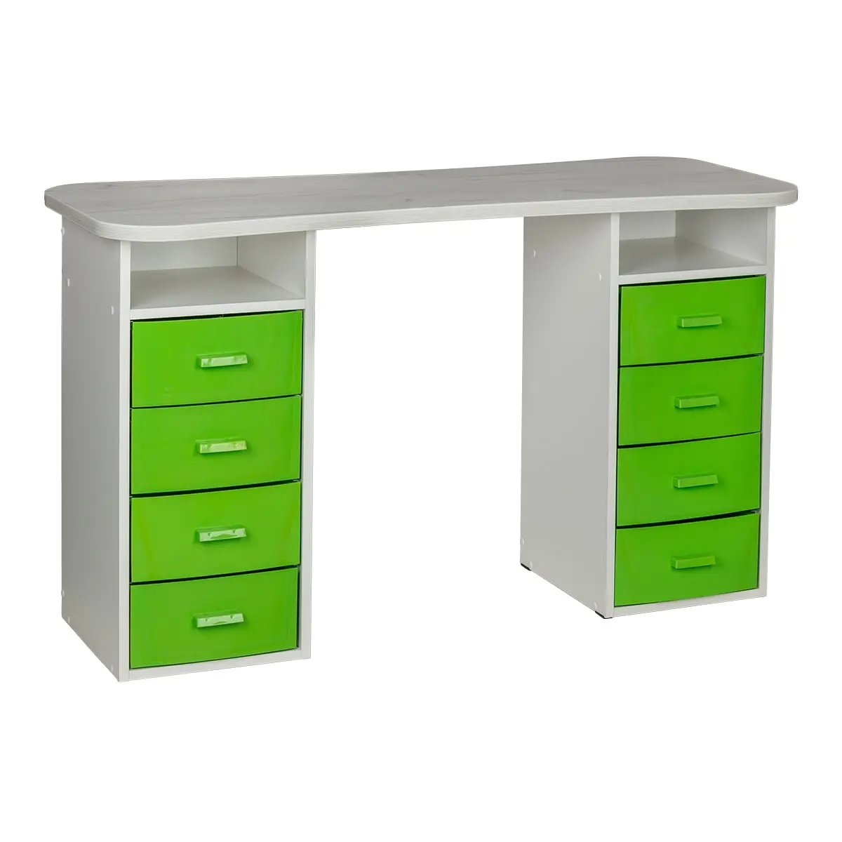 Столешница имеет плавный изгиб посередине, чтобы обеспечить удобный доступ к ноготкам клиентов. На широких сторонах столешницы мастер может поставить необходимые для работы инструменты, аппараты и материалы. Маникюрный стол оснащен двумя тумбами, в которых есть и открытые полки, и выдвижные ящики. Здесь достаточно места для приспособлений, которые временно не используются.