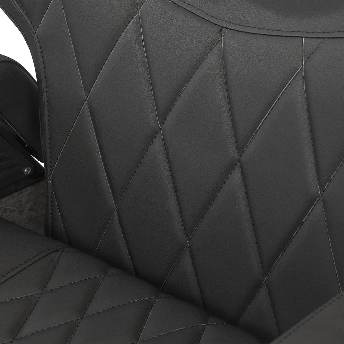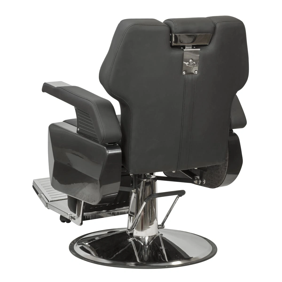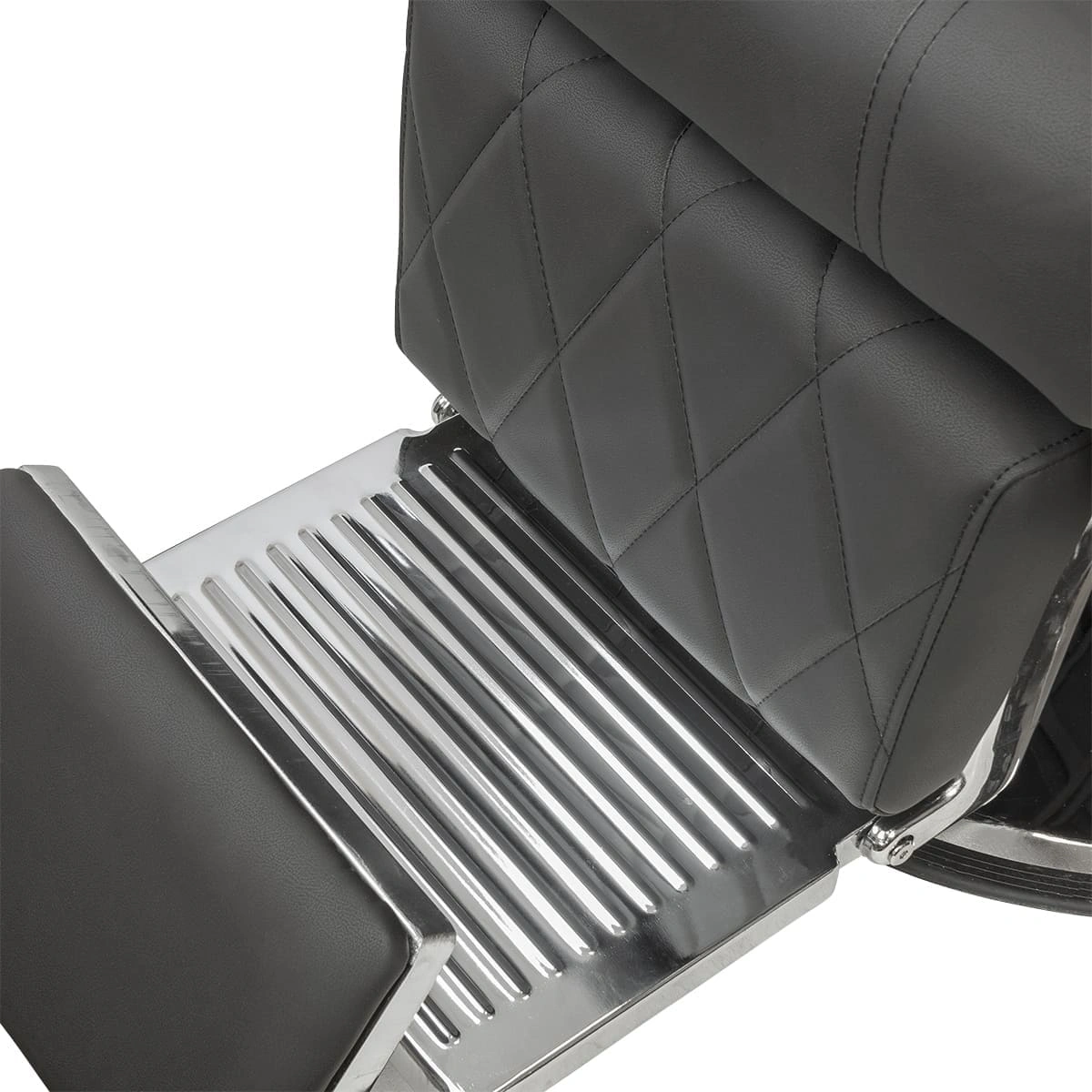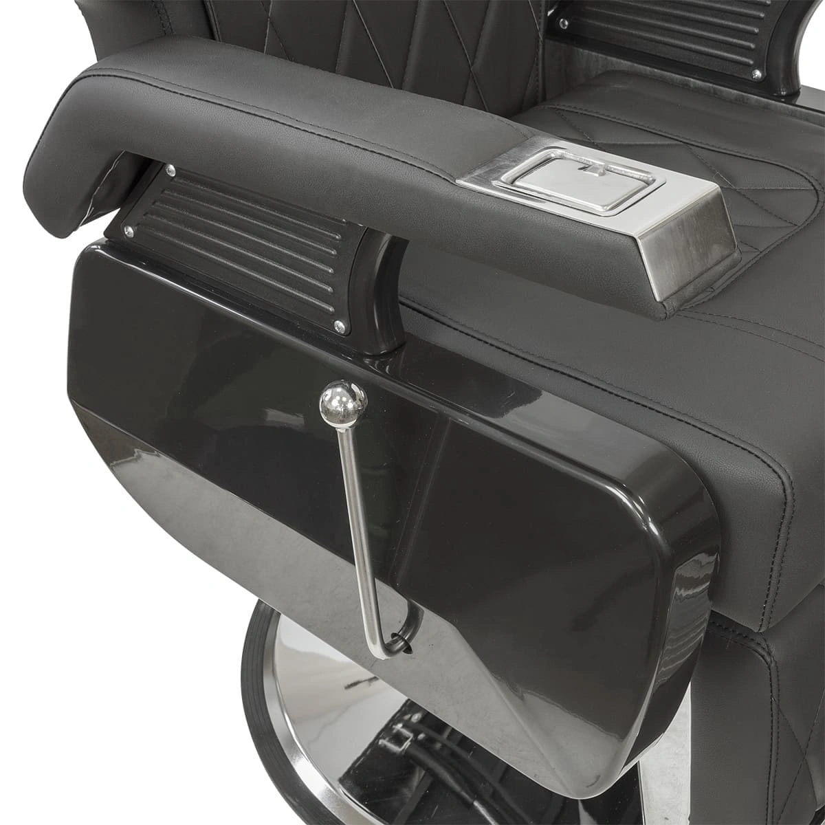 Каркас и основа из прочной стали отвечает за устойчивость массивной мебели для барбершопа. Обивка выполнена из фирменной экокожи с влагостойкими качествами. Спинка, сиденье и подножка украшены стильной прошивкой крупными ромбами. Для наполнителя использован упругий поролон. Благодаря своей структуре материал быстро восстанавливает форму после каждого использования.