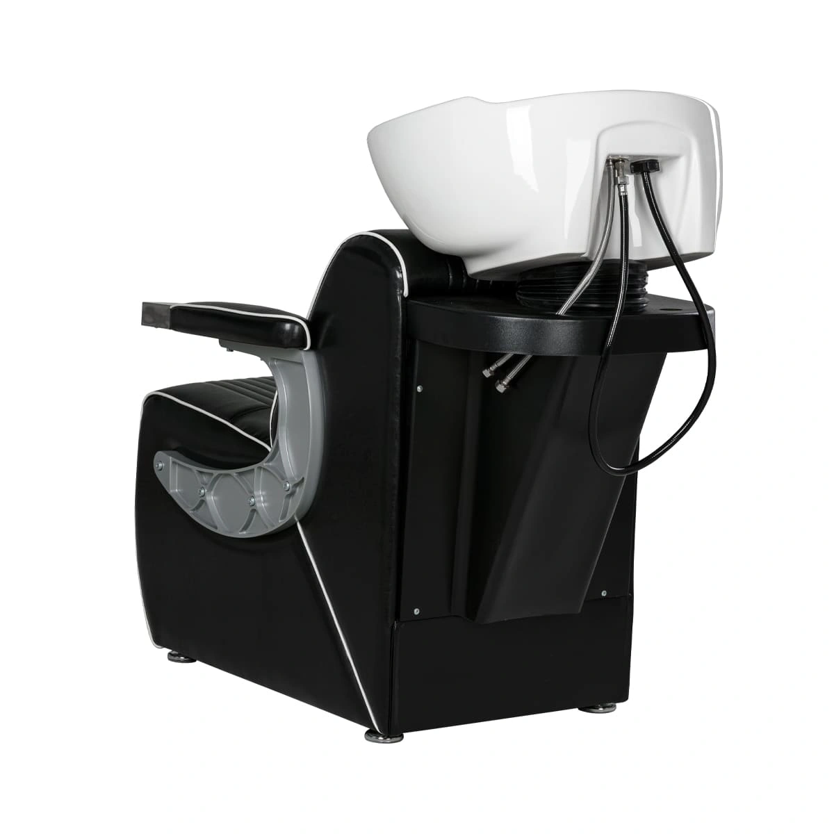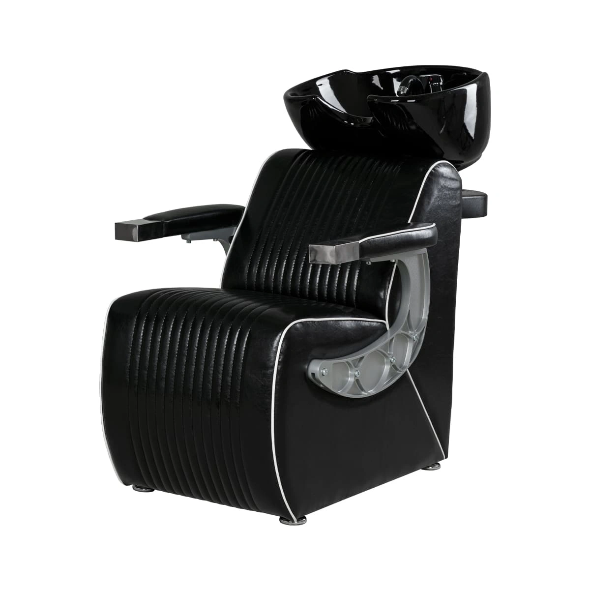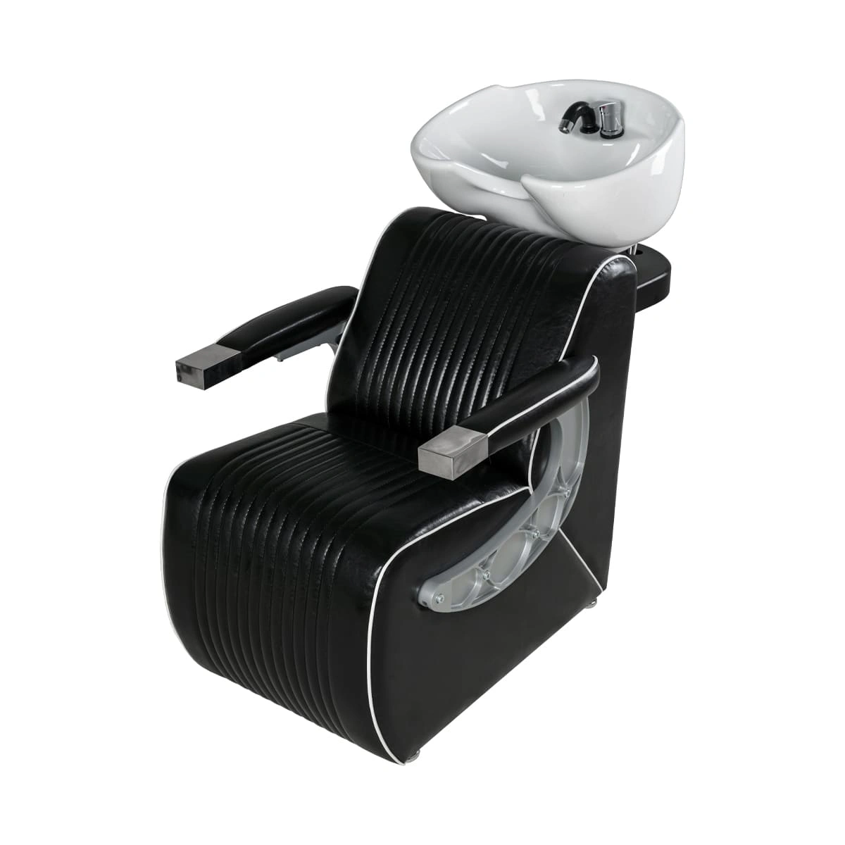 Комплектация мойки: раковина, сантехнические комплектующие, узел наклона раковины, каркас мойки, кресло, хромированные подлокотники с накладками под цвет кресла.