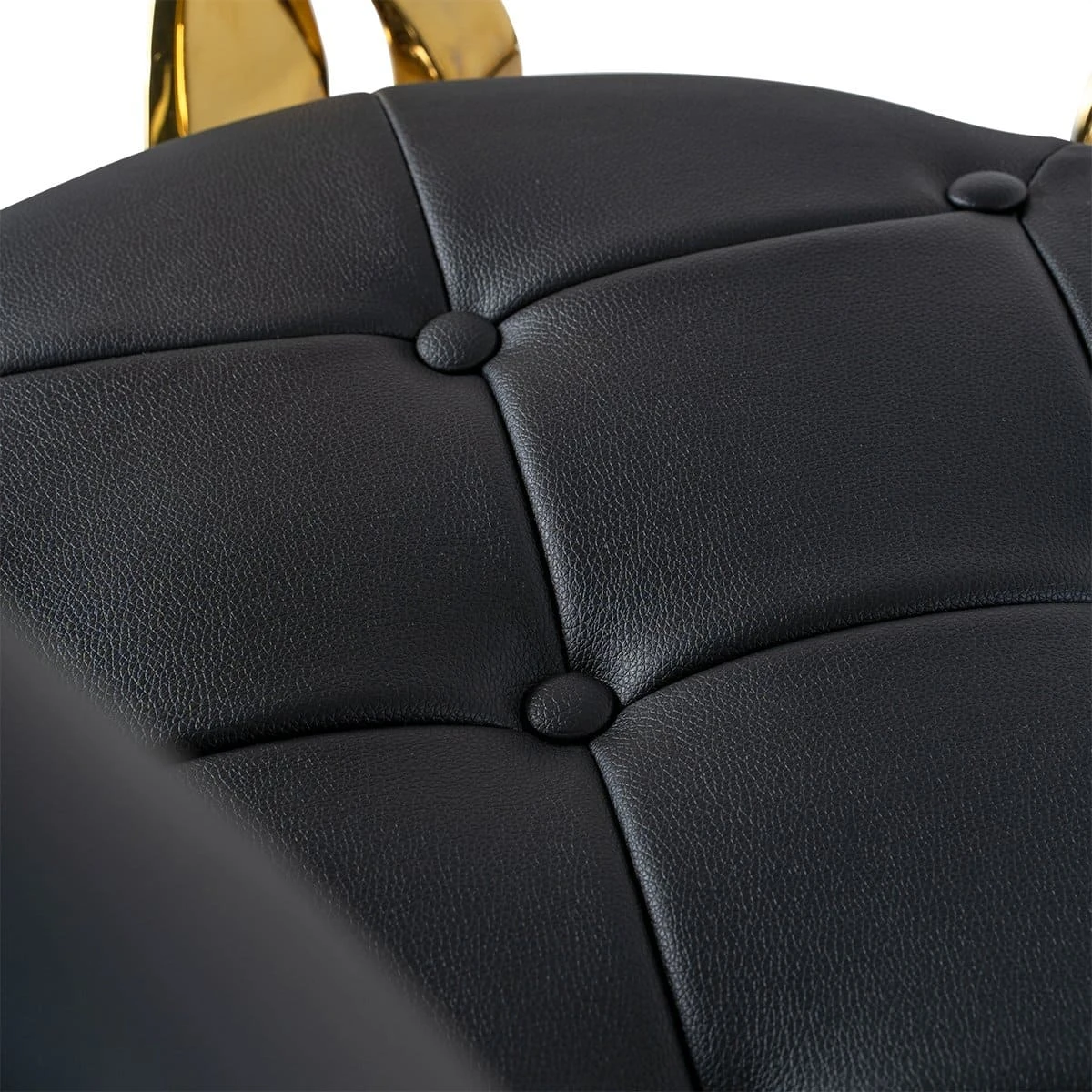 Круглые сиденье и спинка, декоративные металлические детали и фурнитура, полированный каркас в золотом цвете выделяют эту модель среди других кресел. Мягкий выдвижной подголовник поддержит голову и шею клиента. Металлическая подножка с подставкой для ног и накладкой из экокожи– ещё одно практичное дополнение. Она предупредит переутомление ног в течение длительных процедур.