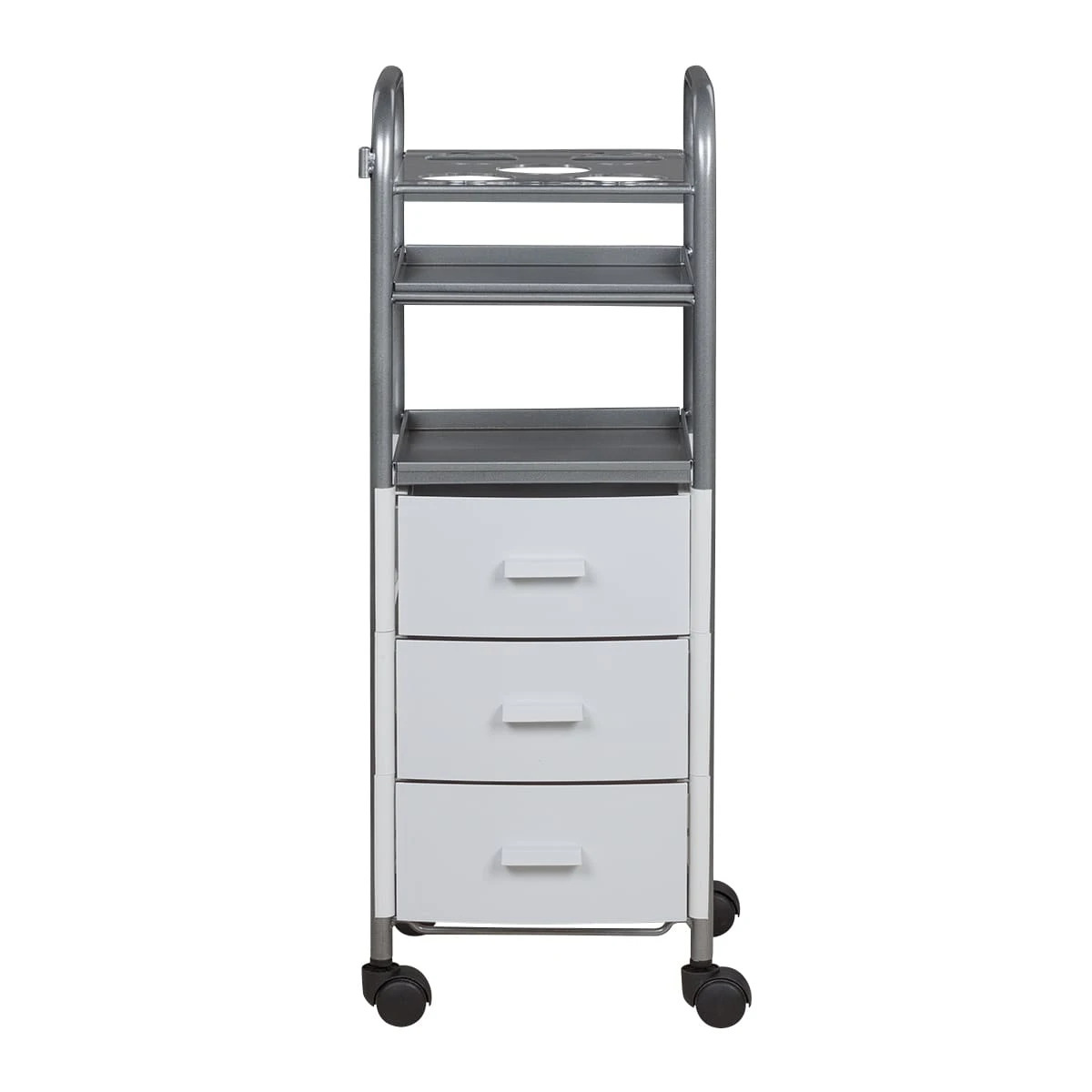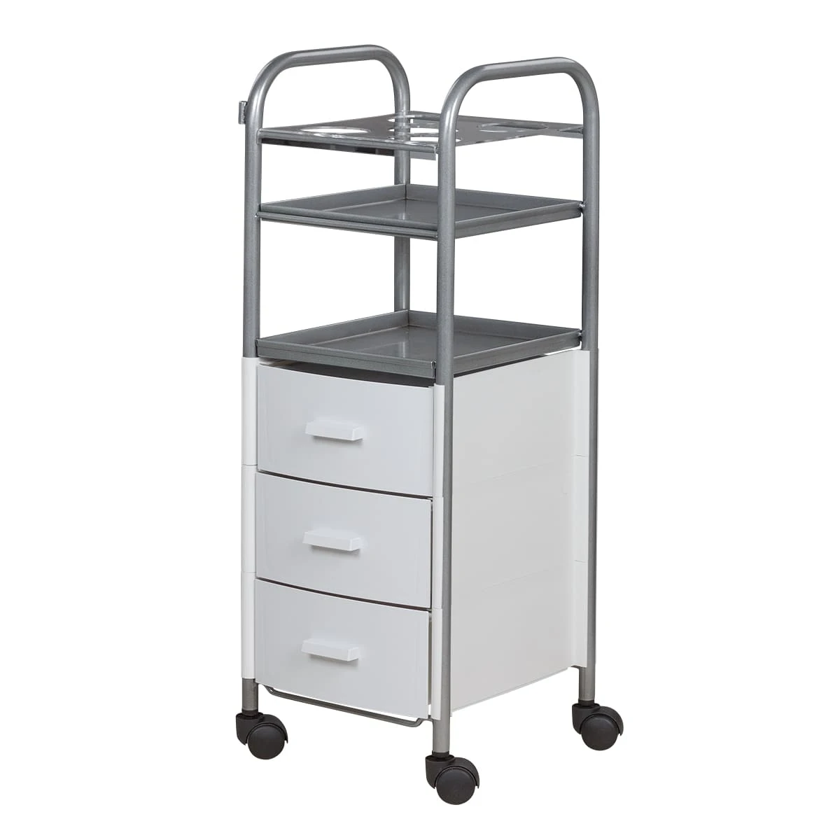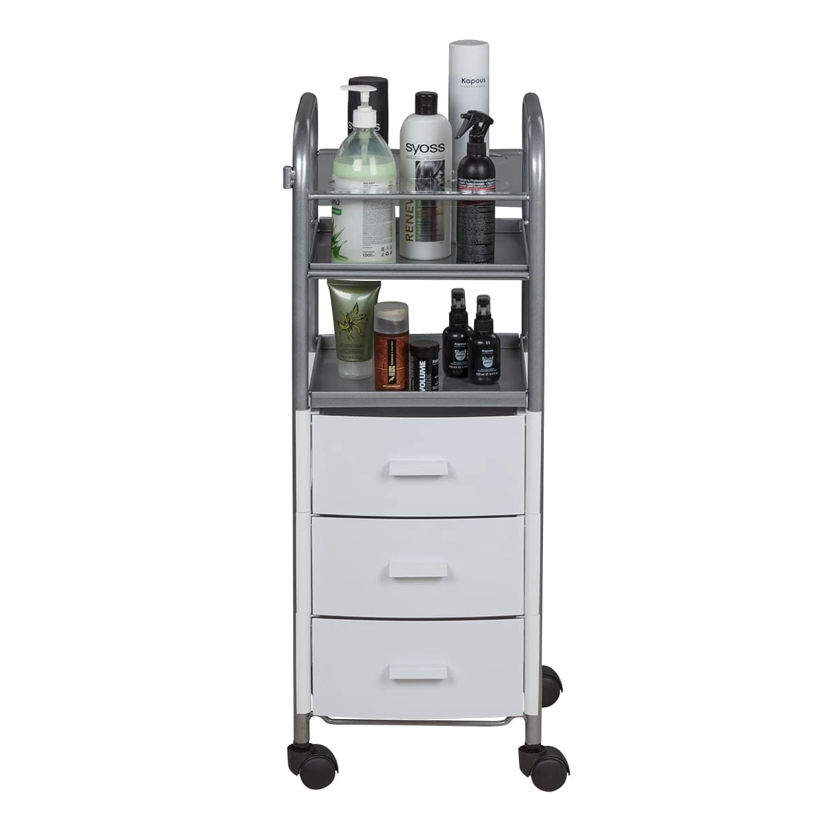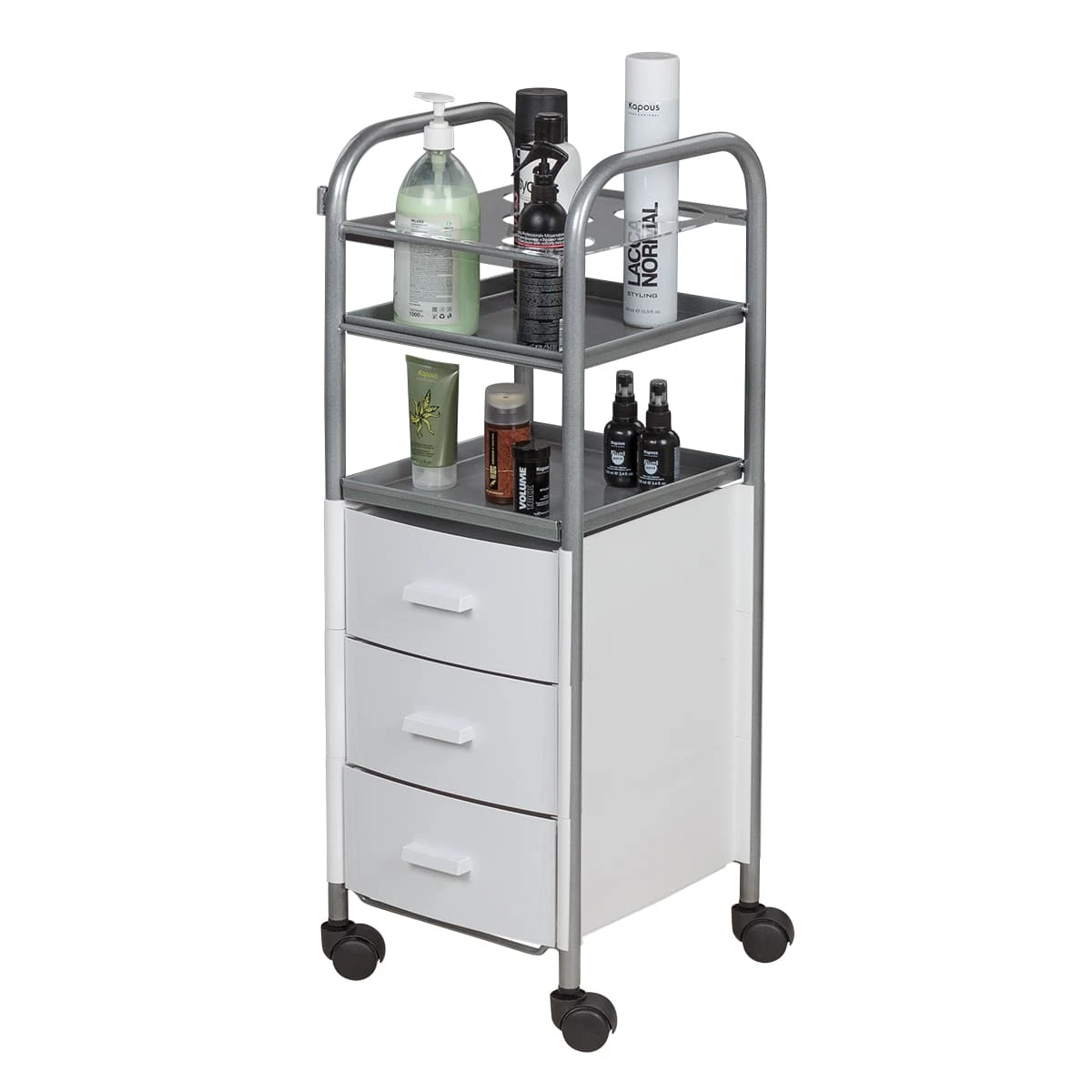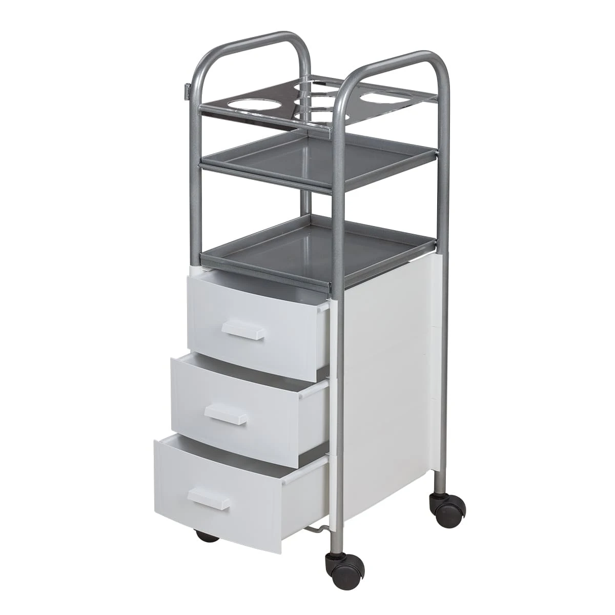 Для инструментов и расходных материалов в тележке предусмотрены три выдвижных ящика. Верхняя полка оснащена специальной панелью с отверстиями для высоких флаконов. Над ящиками есть еще одна практичная полка. Для быстрого и удобного перемещения по кабинету в конструкции предусмотрены маневренные колесики.