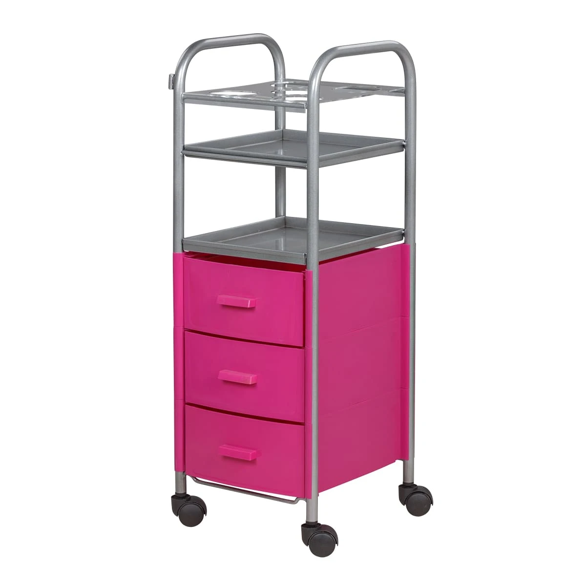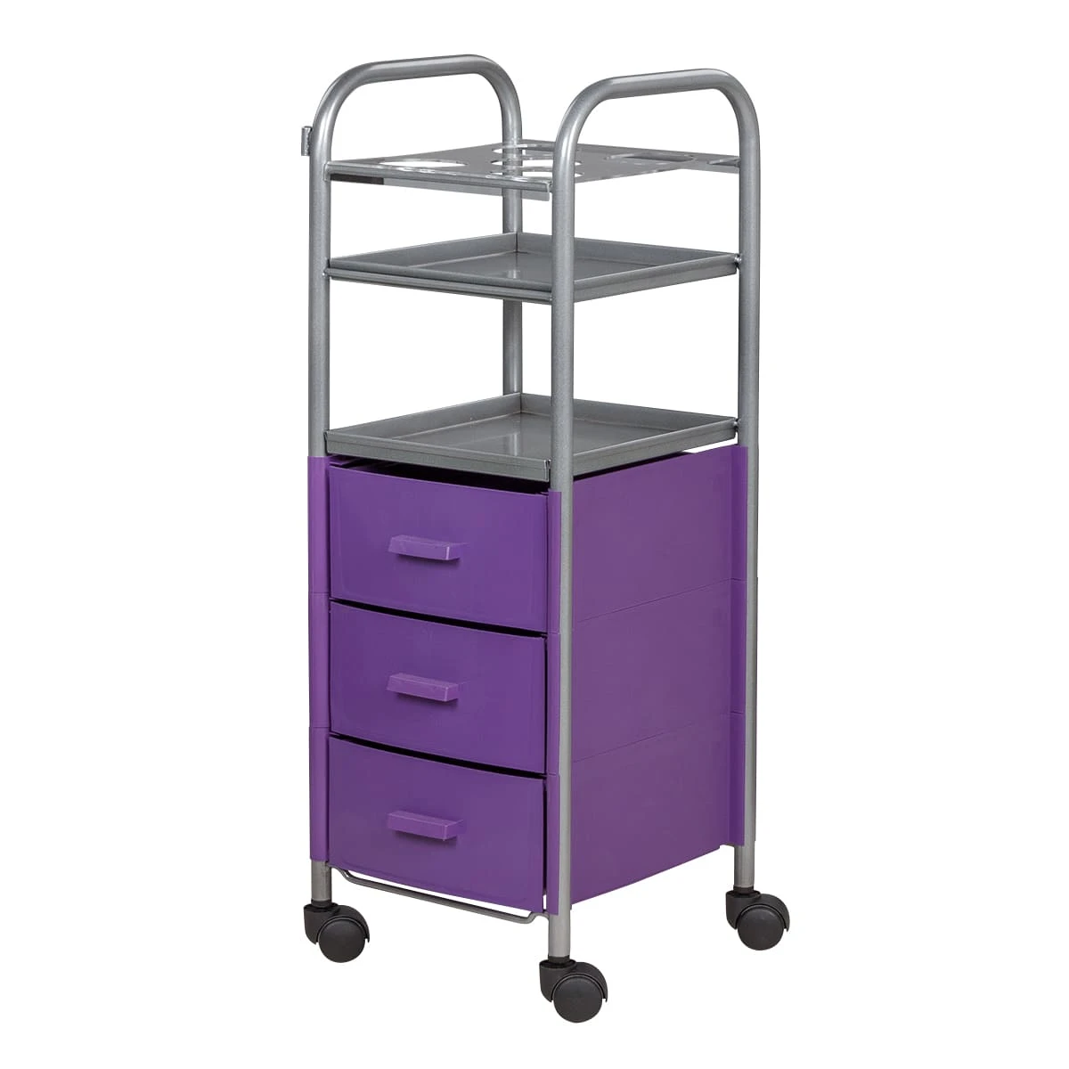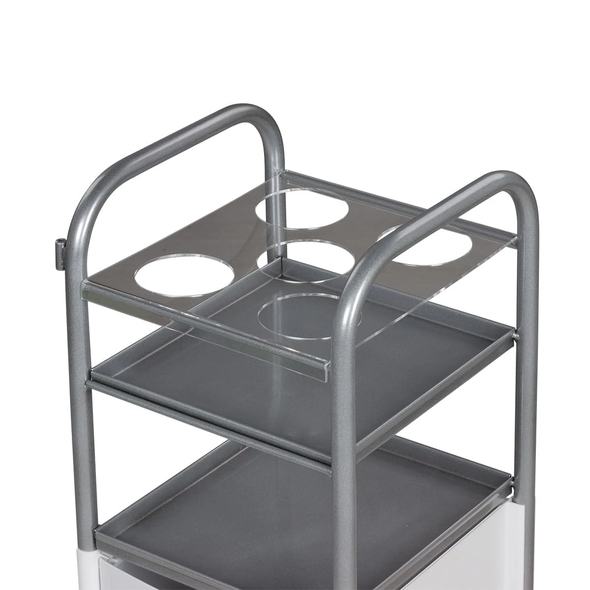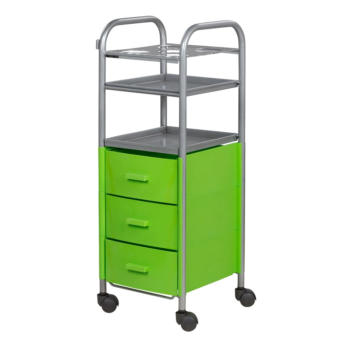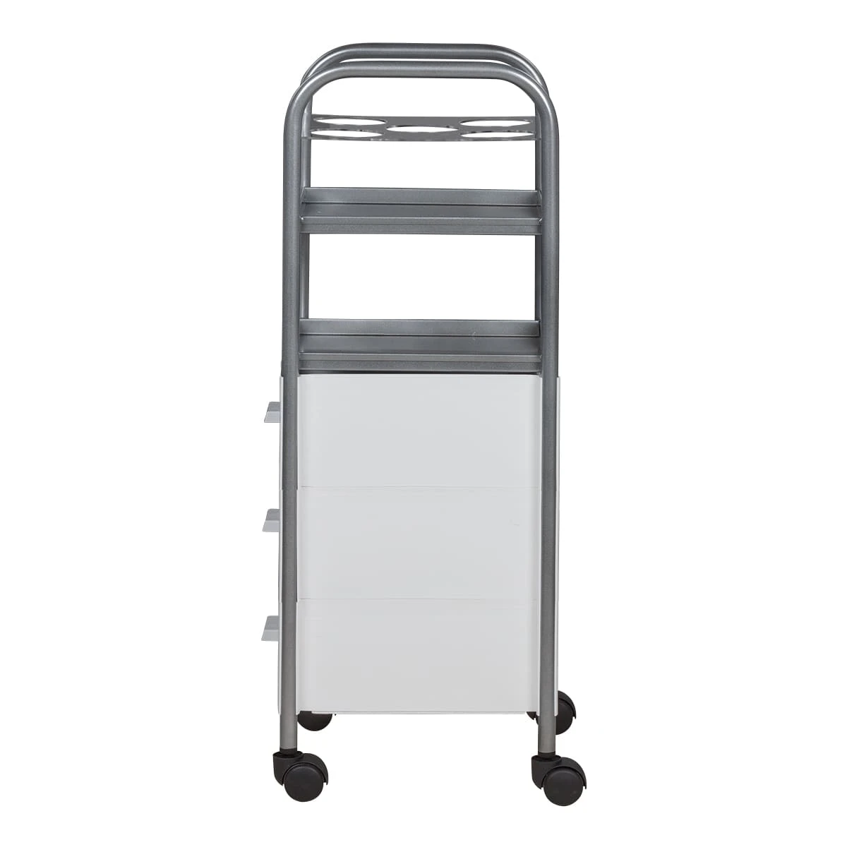 Для инструментов и расходных материалов в тележке предусмотрены три выдвижных ящика. Верхняя полка оснащена специальной панелью с отверстиями для высоких флаконов. Над ящиками есть еще одна практичная полка. Для быстрого и удобного перемещения по кабинету в конструкции предусмотрены маневренные колесики.