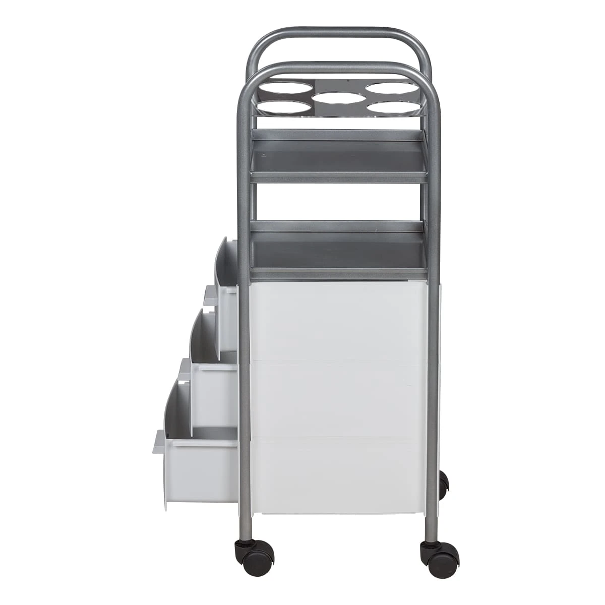 Каркас парикмахерской тележки выполнен из оцинкованной стали. Пластиковые колеса обеспечивают тихое перемещение оборудования и не царапают напольное покрытие. Полки выполнены из металла, устойчивого к воздействию дезинфицирующих и косметических средств. Ящики и боковые стенки изготовлены из ударопрочного пластика.