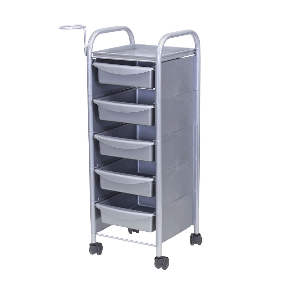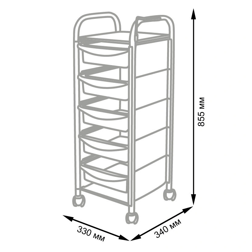 Комплектация: каркас из металла на пластиковых колесах, боковые пластиковые панели, выдвижные ящики, верхняя полка, металлический держатель для фена.