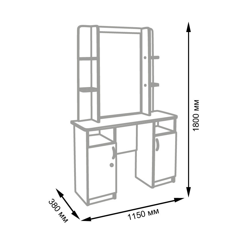 Для удобства по бокам от зеркала установлены полки на всю высоту. Также в комплектацию входит две тумбы с открытыми полками и закрытыми отделениями с дверками. Каждая дверка закрывается на ключ, что обеспечивает надежное хранение ценных приборов и инструментов. Зеркало является очень устойчивым и не требует дополнительного крепления во время установки. Его размеры: