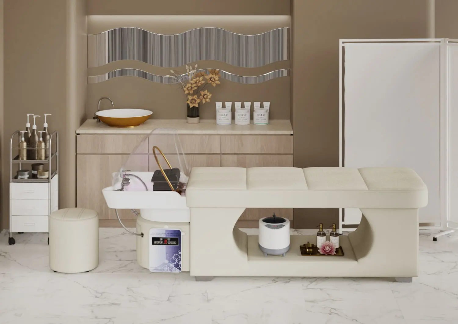 На ней проводятся процедуры head spa: мягкий массаж головы и шеи, ароматерапия, очищение кожи, нанесение питательных масок и сывороток, тёплые компрессы и точечный массаж.