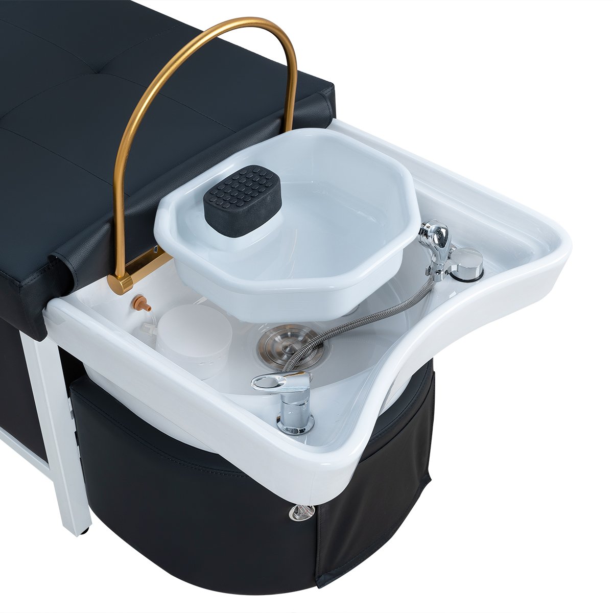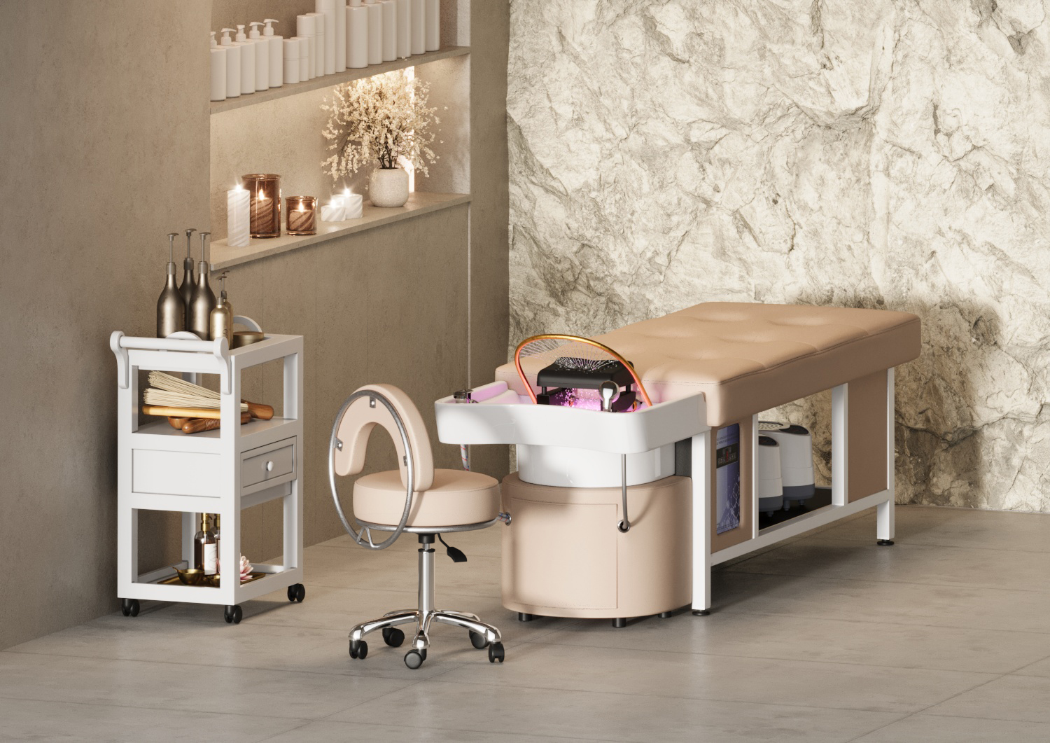 Наоми — спа-кушетка для процедуры head spa, которая превращает обычный уход за волосами в настоящее SPA-путешествие. Продуманная эргономика обеспечивает максимальный комфорт во время процедур, а мягкое ложе поддерживает тело клиента, позволяя полностью расслабиться. Аква-дуга равномерно распределяет потоки воды, создавая эффект глубокого массажа кожи головы и усиливая действие косметических средств.