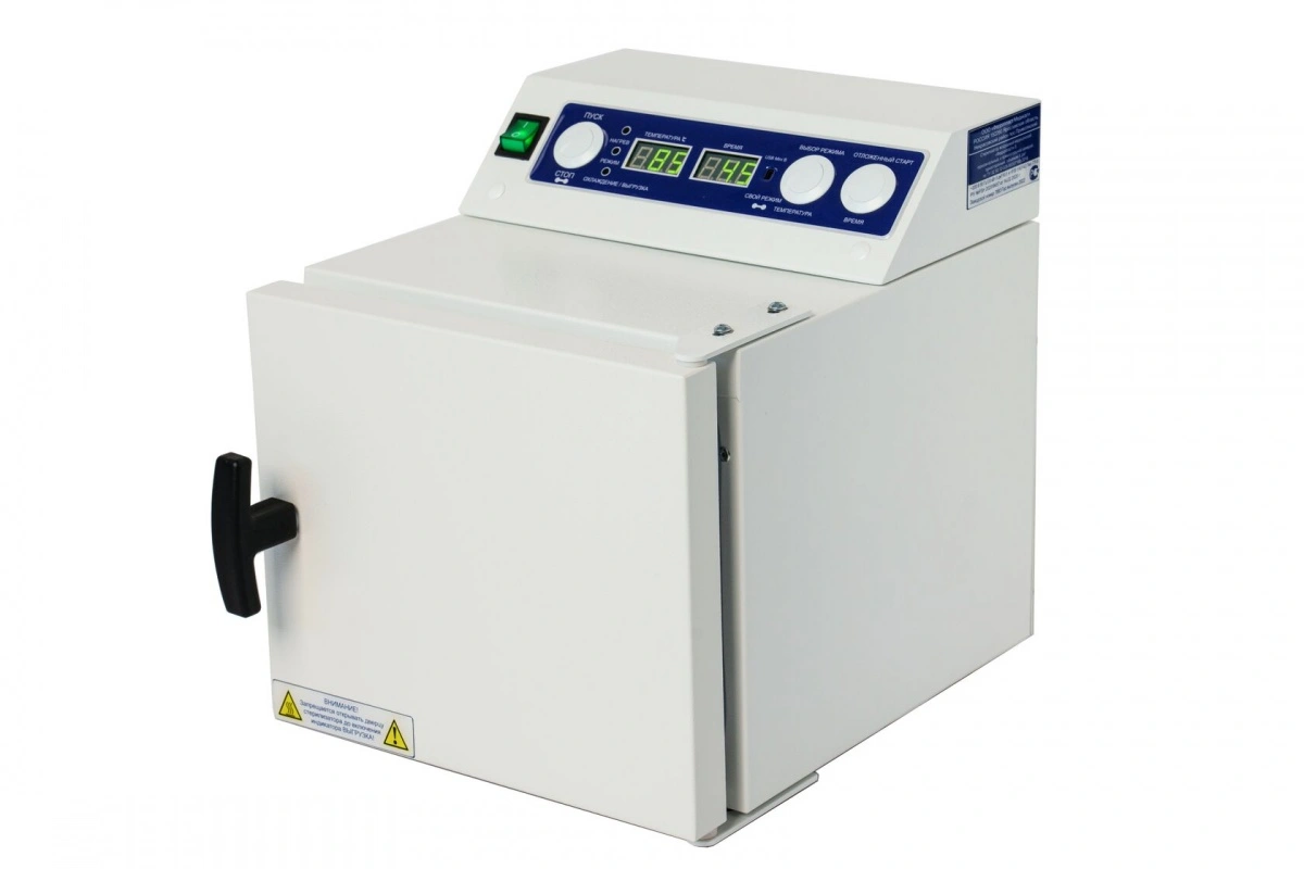 Стерилизатор воздушный медицинский «Ферропласт-5», горизонтальный, с прямоугольной камерой, односторонний и объемом 5 дм³. Предназначен для воздушной стерилизации термическим способом медицинского и маникюрного инструмента, стеклянной посуды и прочих косметических принадлежностей, теплоустойчивых до 200°С. В стерилизаторе предусмотрены режимы работы для дезинфекции и сушки косметологического инструмента и термостойких принадлежностей.