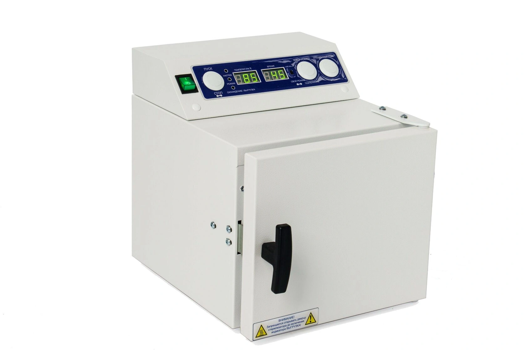 В стерилизаторе "Ферропласт" предусмотрена система звуковой и световой сигнализации режимов работы: